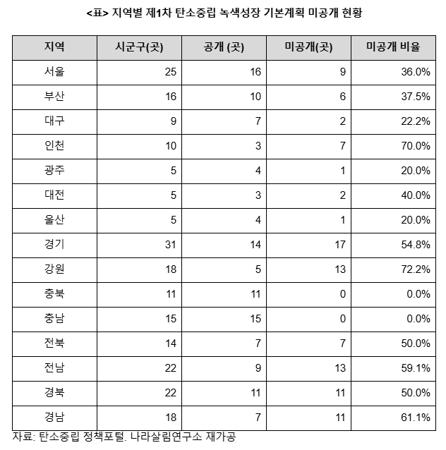 이에 대해 환경부 관계자는 “지자체별로 기초의회 논의 중이거나 탄소중립 지방위원회 심의, 계획 보완 등의 이유로 공개가 지연되고 있다”며 “계획 수립은 진행 중이지만, 최종본 확정 이전에는 게시가 어려운 상황”이라고 설명했다.