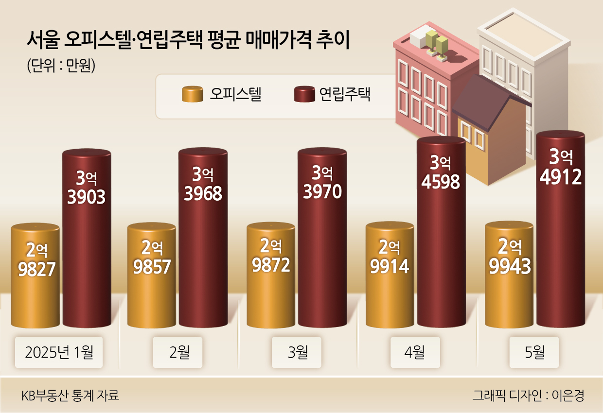 이 같은 추세는 연립주택도 마찬가지다. 서울 연립주택 평균 매매가격은 지난달 3억4912만원으로 2022년 10월(3억6882만원) 이후 가장 높은 수치를 기록했다. 올해 1월 3억3903만원→2월 3억3968만원→4월 3억4598만원 등으로 매달 소폭 오름세다. 거래가격이 오르며 연립주택 매매중위가격 또한 지난달 2억9000만원으로 집계돼 지난해 9월(2억8000만원) 이후 8개월 만에 올랐다.