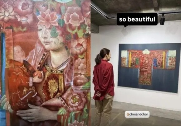 | 가수 이효리가 지난 20일 SNS에 아기를 품에 안은 여성의 모습이 담긴 사진을 관람하는 자신의 모습을 공개했다. [이효리 SNS 갈무리] |