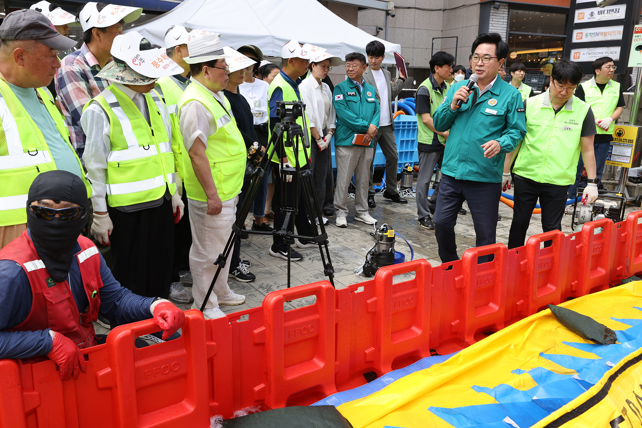 이날 훈련에는 지역주민과 상인 등 50여 명이 참석한 가운데 박일하 구청장이 직접 상황별 행동 요령과 장비 사용법 등을 설명하고, ‘빗물받이 관리자’의 역할에 대해 특별히 강조했다.