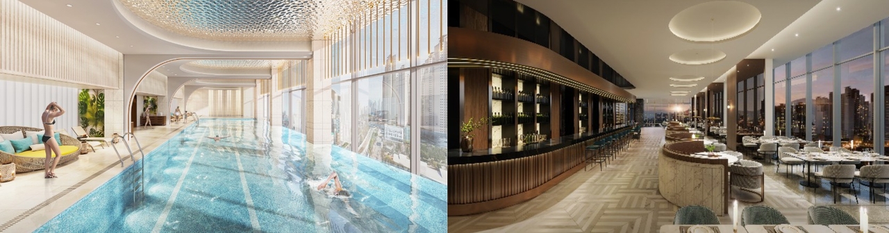 | 3300평에 달하는 커뮤니티 시설에 들어서는 ‘리버뷰 아쿠아풀’(사진 왼쪽)과 시그니처 살롱 [롯데건설, 백송홀딩스] |