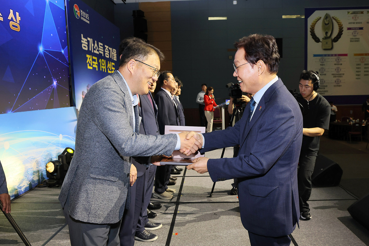 | 장금용(왼쪽) 창원시장 권한대행이 박완수 경남도지사에게 2025년 농산물 수출 시책평가 ‘최우수’ 기관 표창패를 받고 있다. [창원 제공] |