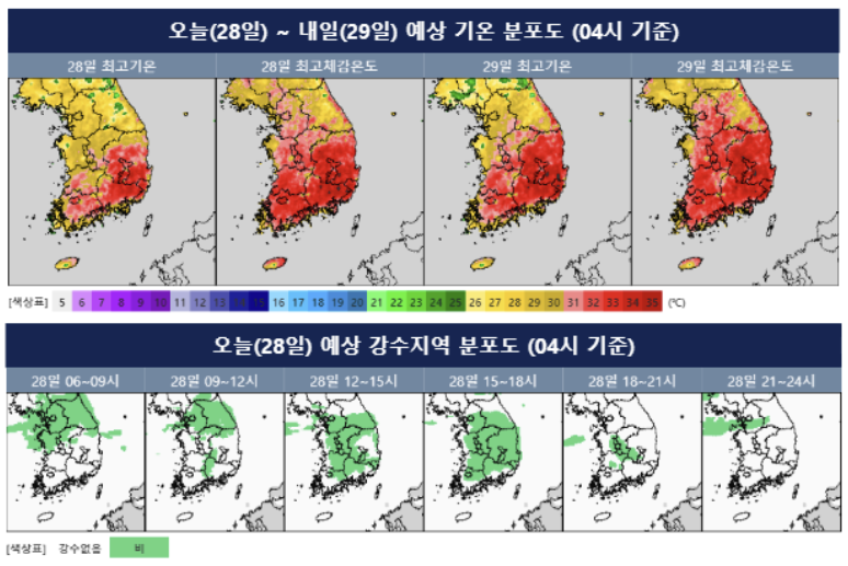 전국 대부분 지역에서 최고 체감온도가 31도 이상(남부지방 33도 내외) 올라 더운 곳이 많겠으니 건강 관리에 유의해야겠다.