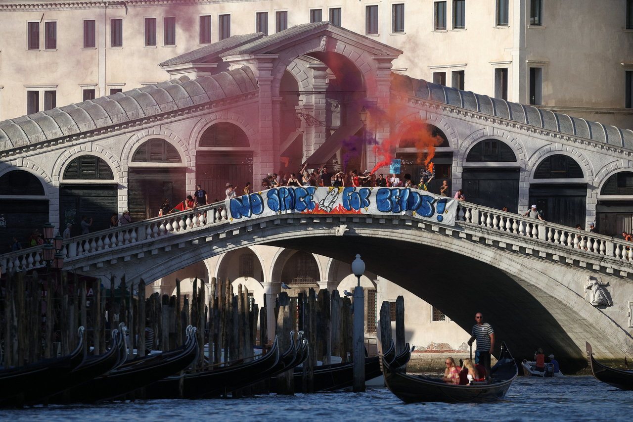 시위대는 ‘베이조스는 떠나라’고 구호를 외치며 행진했고, 리알토 다리 위에 ‘베이조스를 위한 공간은 없다’고 적힌 현수막을 내걸고 조명탄을 쏘아 올리며 항의했다