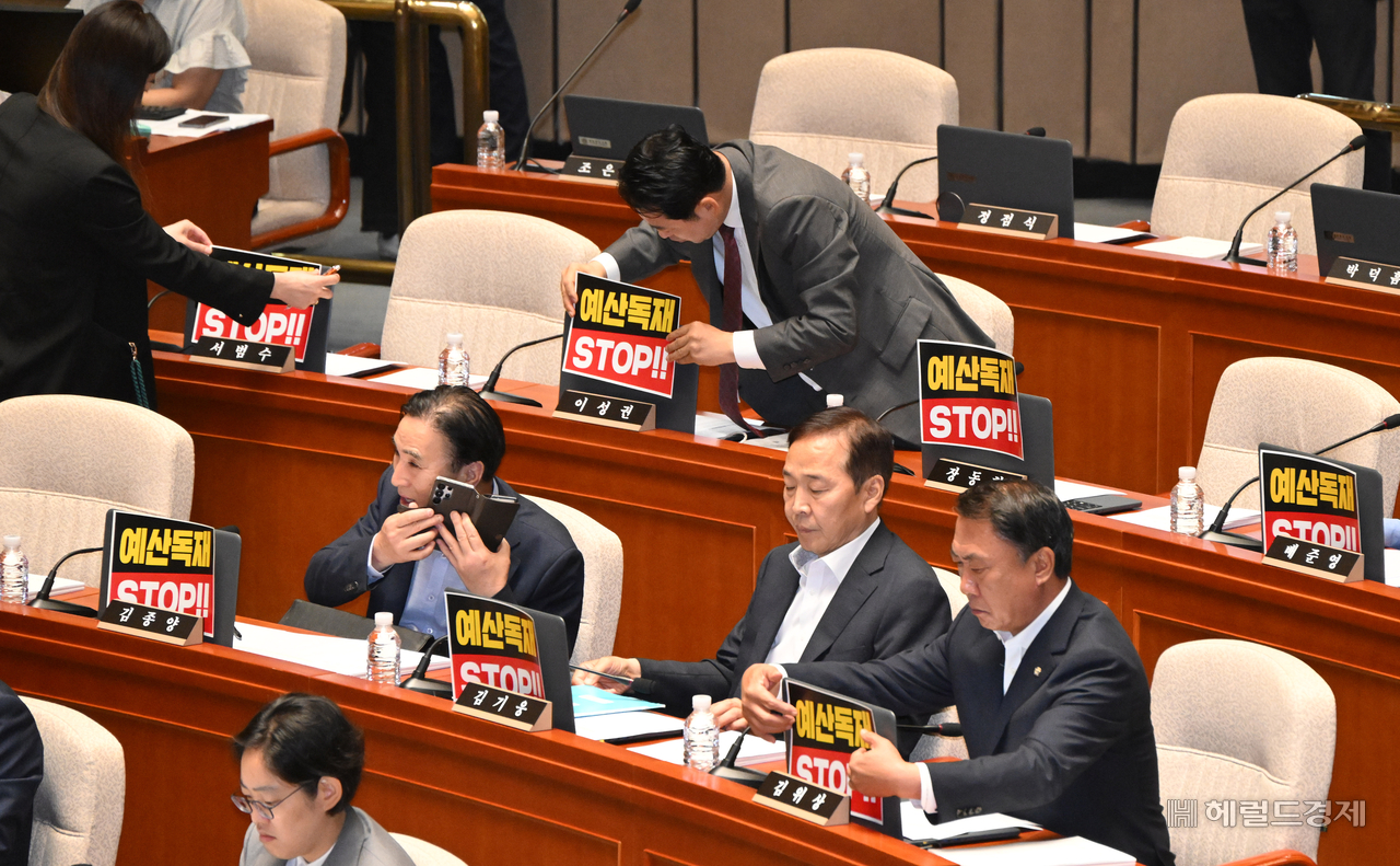 [헤럴드pic] “예산독재 STOP!” 글꼴 선택 본문 텍스트 크게본문 텍스트 작게 인쇄 [헤럴드경제=이상섭 기자] 국회 예산결산특별위원회 야당 의원들이 30일 서울 여의도 국회에서 열린 예결위 제1차 전체회의에 참석하며 노트북에 ‘예산독재 STOP!’이라 적힌 피켓을 부착하고 있다.