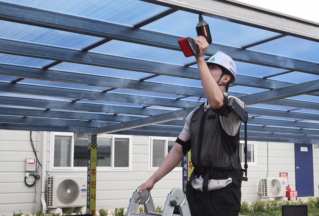 | 현대건설 관계자가 지난 27일 현대·기아차 로보틱스랩에서 개발한 ‘엑스블 숄더(X-ble Shoulder)’를 착용 후 시연하고 있다. [자료=현대건설] |