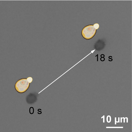 | 비대칭적인 세포-껍질 구조를 지닌 세포로봇의 자가추진 이동양상을 보여주는 현미경 이미지.[KAIST 제공] |