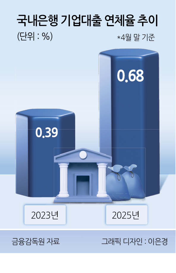금융감독원에 따르면 지난 4월 말 기준 국내은행의 기업대출 연체율은 0.68%로 지난 2023년 4월 말(0.39%) 대비 0.29%포인트 올랐다. 특히, 올해 4월 말 중소기업의 연체율은 0.83%로 대기업(0.13%)보다 6배 넘게 높았다.