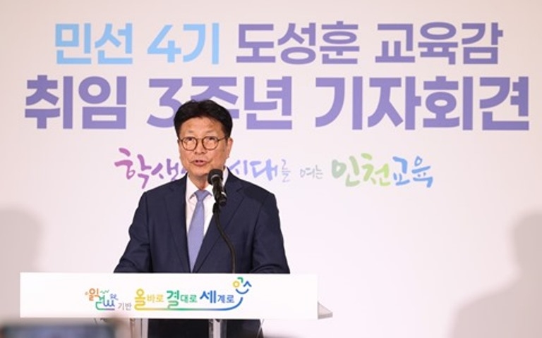 | 도성훈 인천시교육감이 30일 취임 3주년 기자회견을 하고 있다.[인천시교육청 제공] |