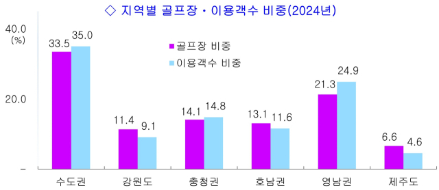 18홀 환산 골프장 수는 지난해말 기준으로 601.6개소로, 수도권이 202개소로 가장 많았고 전국의 33.5%를 차지했다. 지난해 골프장 이용객수 비중에선 수도권이 전국의 35%를 차지해 가장 높았고, 영남권이 24.9%를 기록했다.