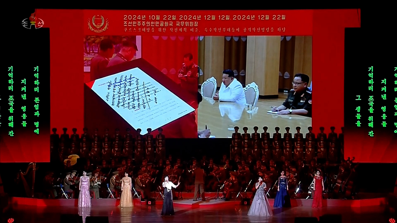 한편 이 공연의 배경 영상 가운데는 ‘2024년 10월 22일, 2024년 12월 12일, 2024년 12월 22일 조선민주주의인민공화국 국무위원장 쿠르스크 해방을 위한 작전 계획 비준, 특수작전 부대들에 공격작전명령을 하달’이라는 자막과 함께 김 위원장이 명령을 지시하는 듯한 사진도 공개됐다.