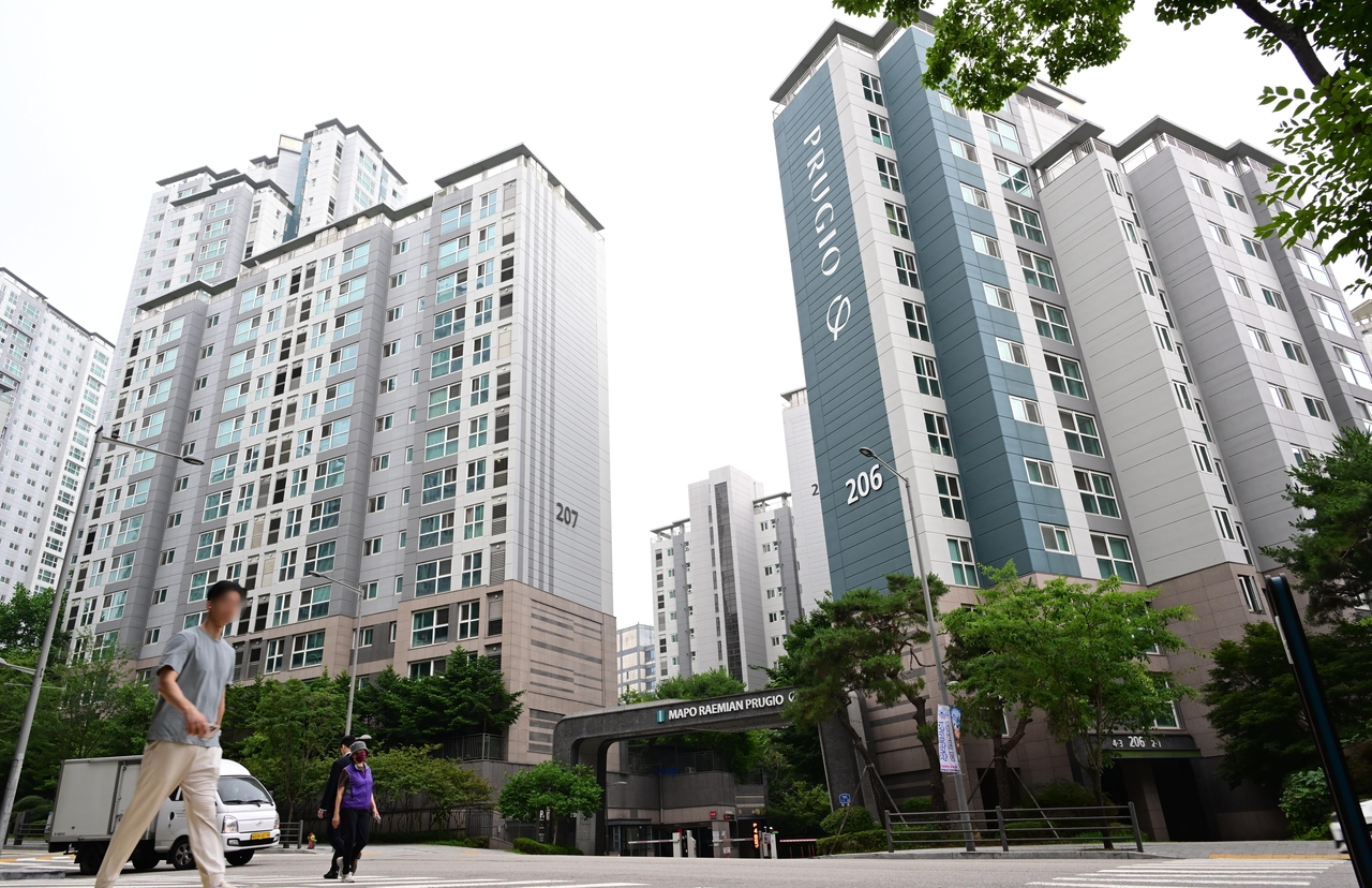 | 서울 마포구 아현동 마포래미안푸르지오 앞을 주민들이 지나고 있는 모습. [헤럴드DB] |