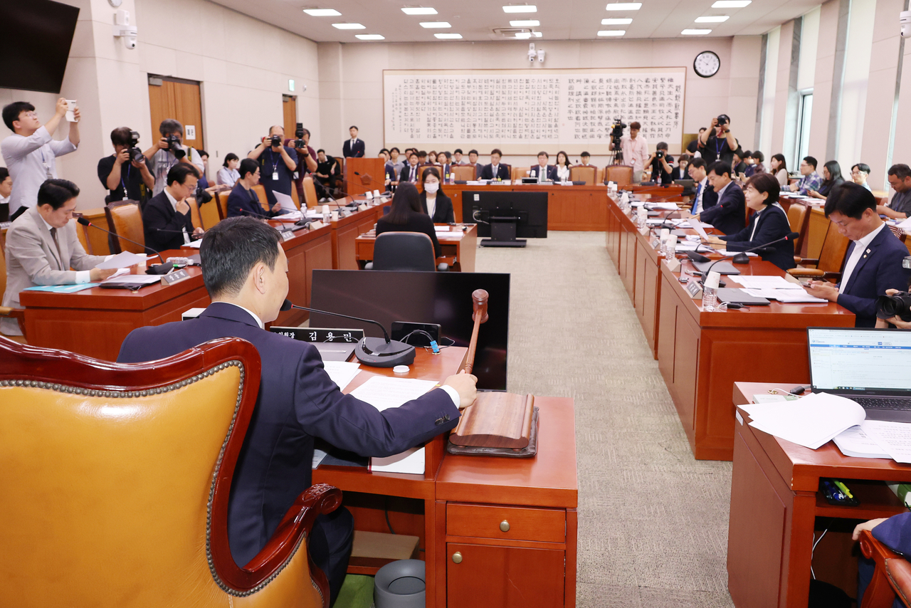 | 2일 국회 법제사법위원회 법안심사제1소위원회에서 더불어민주당 소속 김용민 소위원장이 상법 일부개정법률안 등 안건을 상정하며 의사봉을 두드리고 있다. [연합] |