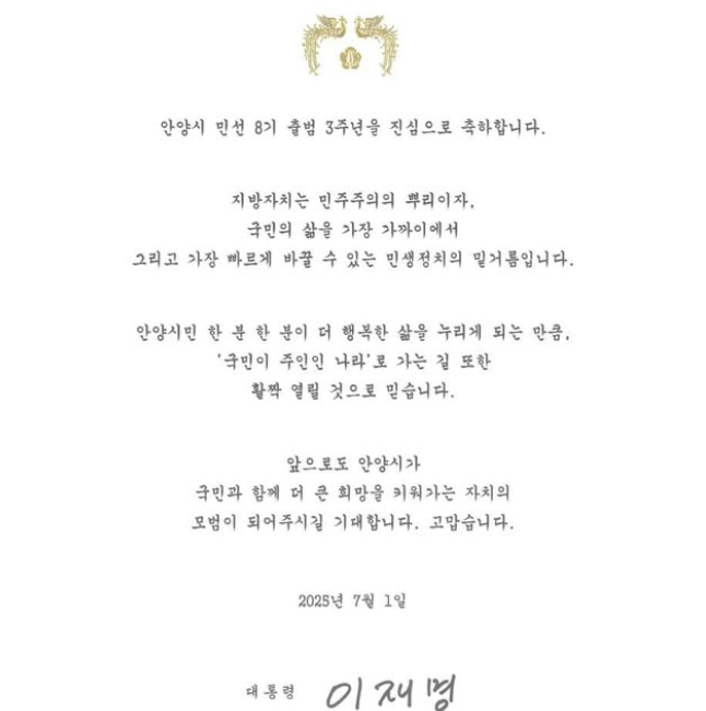 [헤럴드경제(안양)=박정규 기자]최대호 안양시장이 민선 8기 출범 3주년을 맞아 이재명 대통령 축하 메시지를 받았다.