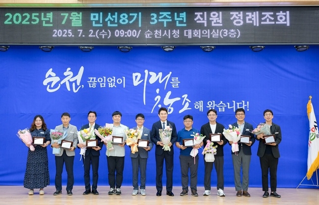 순천시는 7월 직원 정례조회에 앞서 시 직원들을 대상으로 2025년도 상반기 적극행정 우수사례에 대한 시상식을 개최했다 3일 밝혔다.