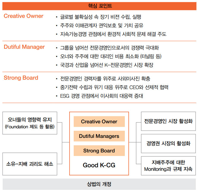 마지막으로 저자는 한국 기업지배구조의 바람직한 미래로 ‘창의적인 오너, 충실한 전문경영인, 강한 이사회(Creative Owner, Dutiful Manager, Strong Board)’를 제안했다. 이는 마크 로(Mark Roe) 미국 하버드대 법대 교수가 전문경영인 체제를 ‘Strong Managers, Weak Owner’로 표현한 것에 착안한 것이다.