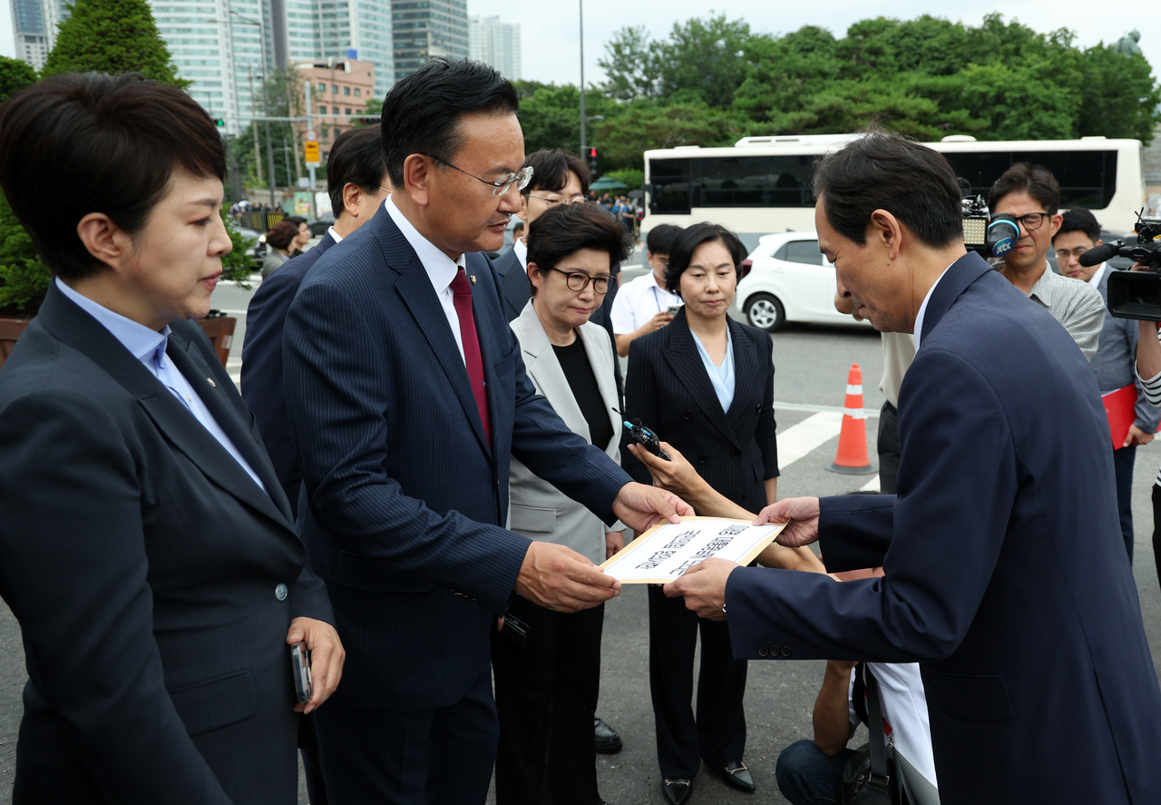 | 국민의힘 유상범 원내운영수석부대표와 김은혜 원내정책수석부대표가 4일 용산 대통령실 정문에서 우상호 정무수석에게 더불어민주당 대통령실 특수활동비 증액 추진 관련 항의서한을 전달하고 있다. 2025.7.4 [공동취재] <연합뉴스> |