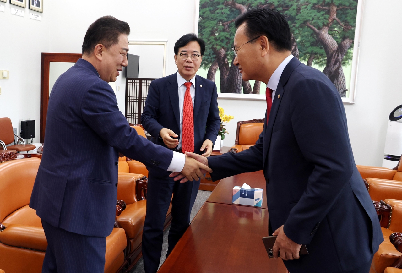 | 김병기 더불어민주당 당대표 직무대행 겸 원내대표(왼쪽)와 송언석 국민의힘 비상대책위원장 겸 원내대표(가운데), 같은 당의 유상범 원내운영수석부대표가 1일 오후 서울 여의도 국회에서 추경안 관련 비공개 회동을 하고 있다. [뉴시스] |