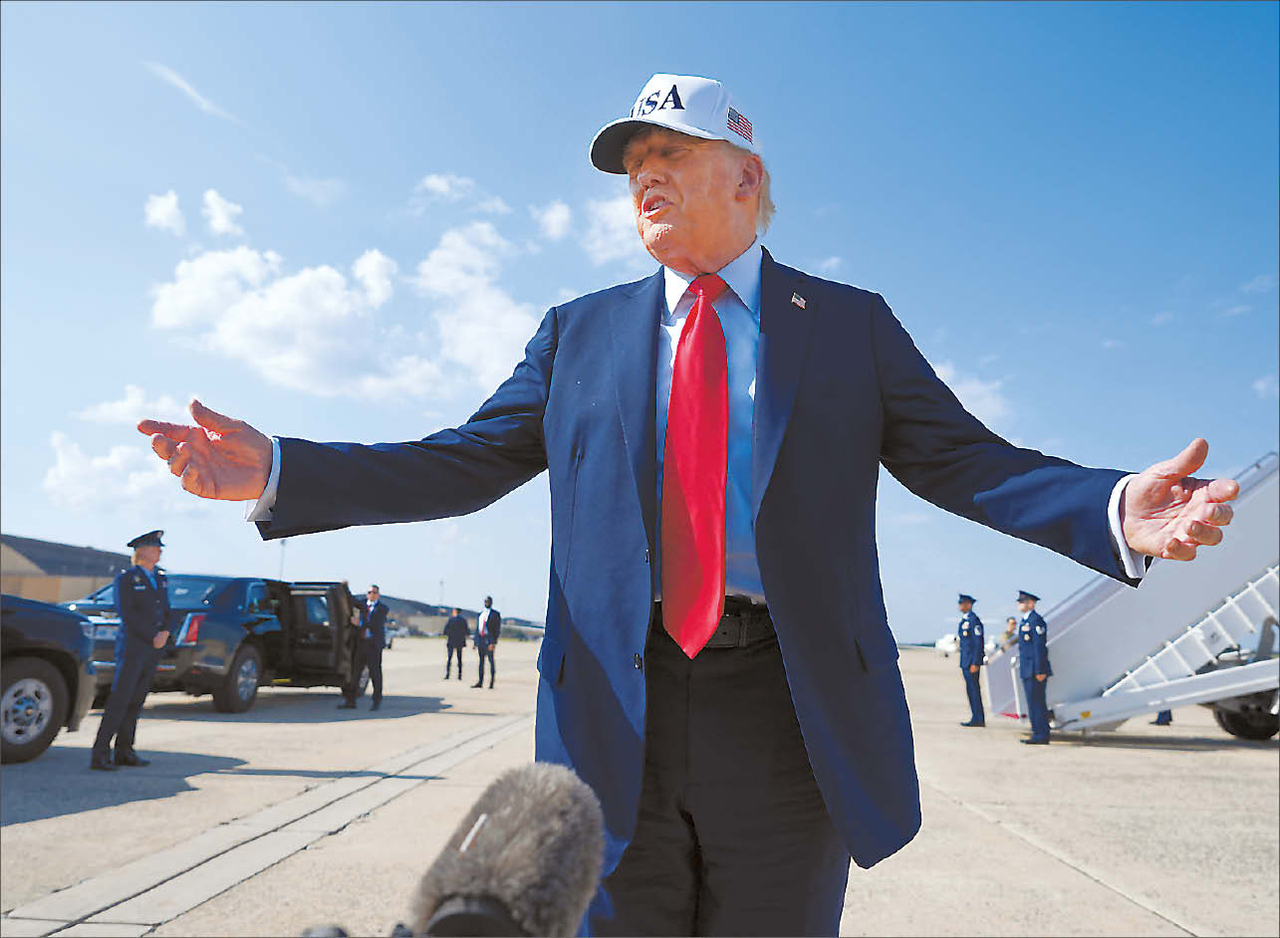 | 도널드 트럼프 미국 대통령이 3일(이하 현지시간) 미 메릴랜드주 앤드루스 합동기지에서 에어포스 원에 탑승하기 전 기자들과 대화하고 있다. [AP] |