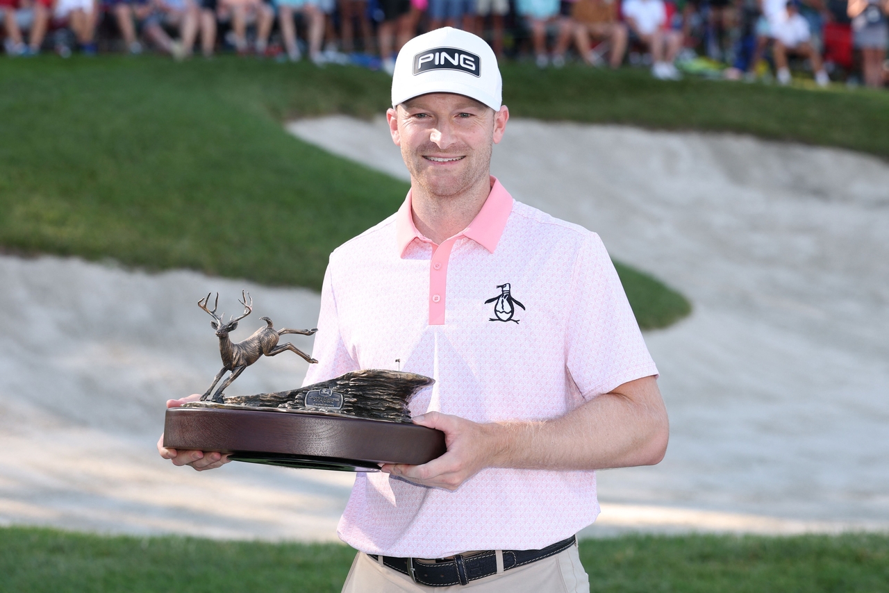 | 브라이언 캠벨이 PGA 투어 존디어 클래식 우승컵을 들고 포즈를 취하고 있다. [AFP] |