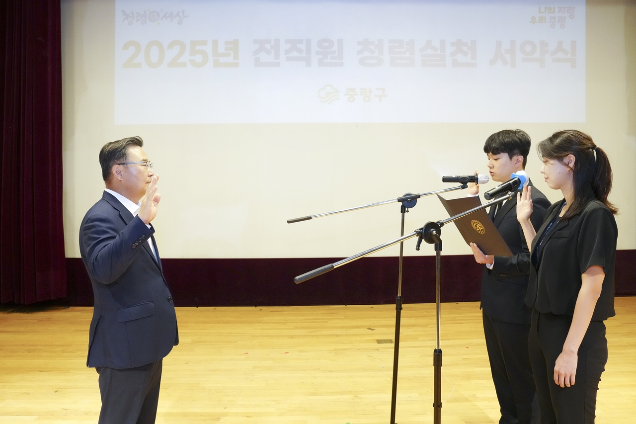 [헤럴드경제=박종일 기자]중랑구(구청장 류경기)가 8일 공직사회의 청렴문화 정착과 내부통제 강화를 위해 전 직원을 대상으로 청렴실천 서약식과 부패방지 교육을 실시했다.