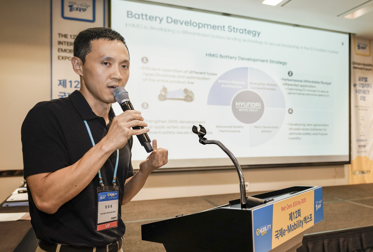 | 8일 포럼에서 주제 발표를 하고 있는 정창호 현대차·기아 기술연구소 배터리성능개발실장 [한국자동차기자협회 제공] |