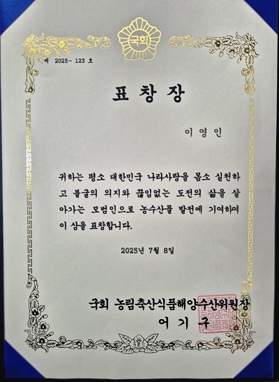 | <사진 : 이영인 대표에게 수여된 국회 농림축산식품해양수산위원장 표창장. 농수산물 발전과 지역사회 기여에 대한 공로가 명시돼 있다.> |