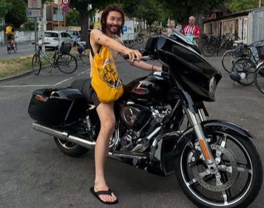 사진 속 노홍철은 스위스 길거리를 배경으로 대형 오토바이에 올라탄 채 환하게 웃고 있다.
