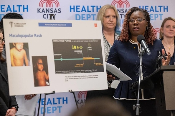 | 미국 캔자스시티 보건국장 마비아 존스가 지난 4월 29일 캔자스시 홍역 대책 기자회견에서 질문에 답하고 있다. [게티이미지] |