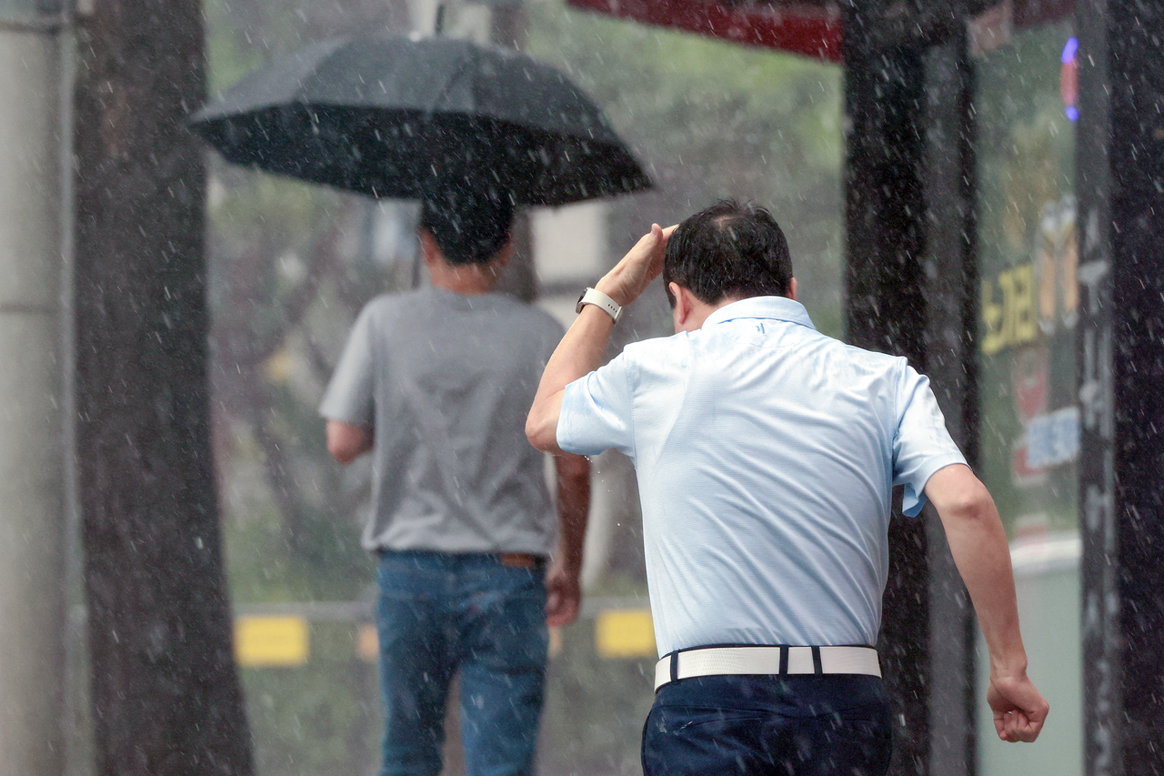 | 전국 곳곳 비가 내린 지난달 16일 서울 서대문구에서 한 시민이 손으로 비를 막으며 뛰어가고 있다. [연합] |