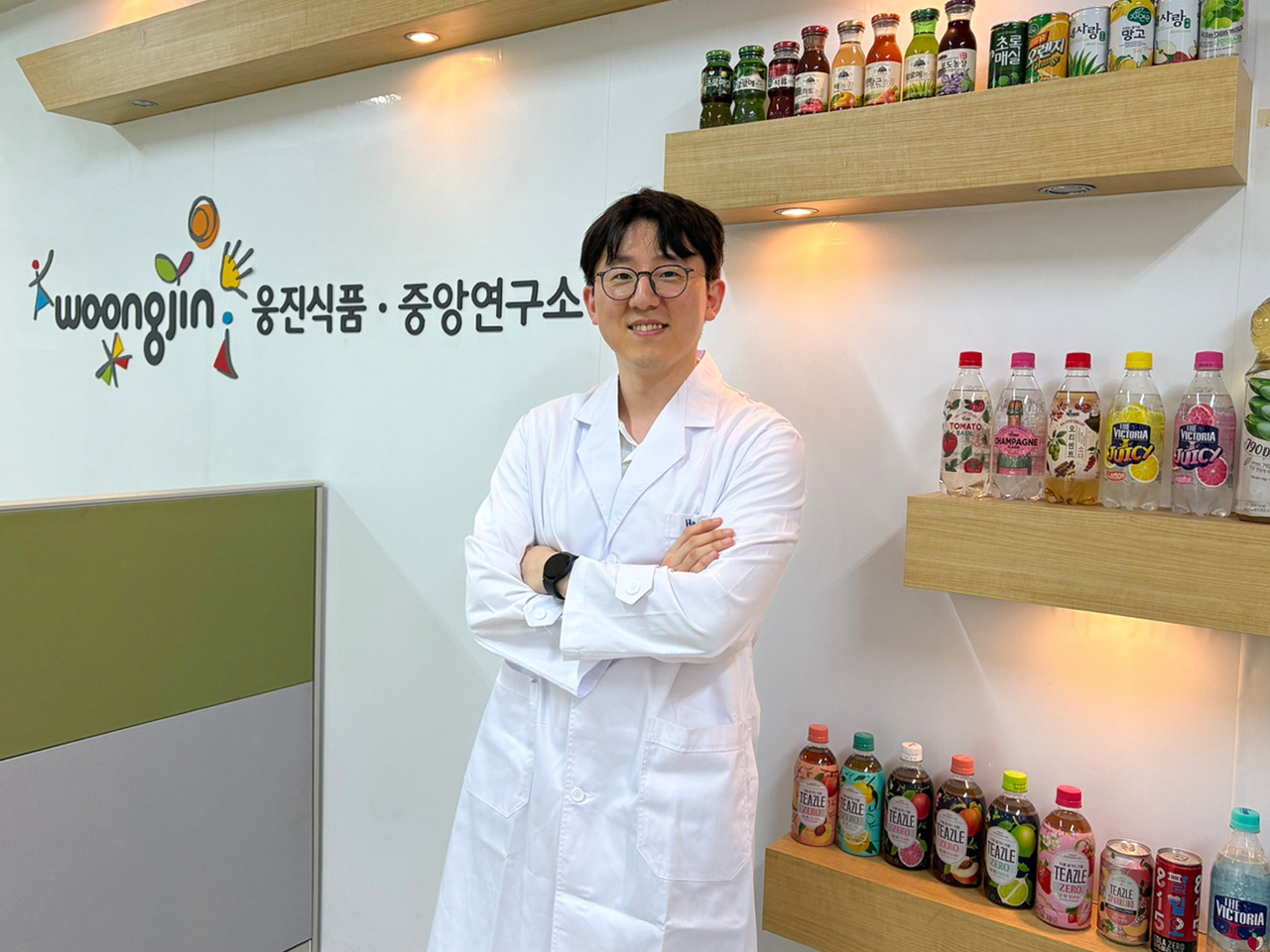 | 한현구 웅진식품 연구원이 지난 9일 서울 금천구 웅진식품 중앙연구소에서 가진 헤럴드경제와의 인터뷰에서 포즈를 취해 보이고 있다. 옆에 있는 음료는 그가 개발한 ‘더 빅토리아 토마토바질소다’이다. 박연수 기자 |