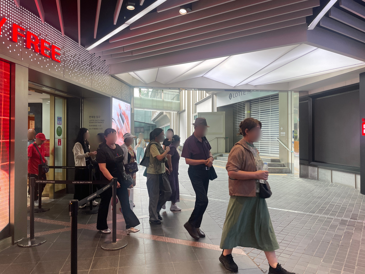 | 롯데면세점(왼쪽)을 방문한 외국인 관광객. 맞은 편 1층 스타에비뉴는 현재 유니클로 입점 공사가 진행 중이다. 전새날 기자 |