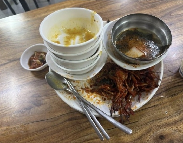 함께 올린 사진을 보면 큰 접시 위에 간장 게장을 먹고 남긴 것으로 보이는 게 껍데기가 놓여있고, 나머지 빈 부분에는 국그릇들과 접시가 포개져 있다.
