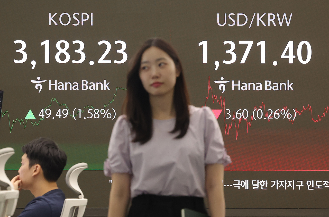 | 코스피가 전장보다 49.49p(1.58%) 오른 3183.23로 마감하며 연중 최고점을 경신한 10일 오후 서울 중구 하나은행 딜링룸에서 딜러들이 업무를 보고 있다. 이날 원/달러 환율은 오후3시30분 기준 전날보다 5.0원 내린 1370.0원을 기록했고, 코스닥은 7.34포인트(0.93%) 오른 797.70으로 마감했다. [연합] |