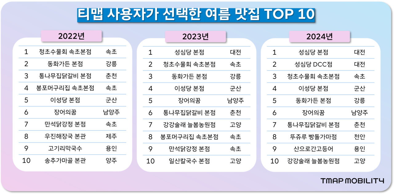 2022년 1위였던 ‘청초수물회(속초)’는 2023년 2위, 2024년 3위로 3년 연속 상위권에 이름을 올렸다.