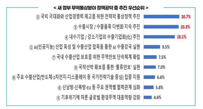 이 외에도 ▷인공지능(AI) 산업 육성 및 수출산업 접목을 통한 ‘AI 수출강국’ 실현(9.5%), ▷국내 수출산업 보호를 위한 무역안보 단속체계 확립(7.5%), ▷국적선박 확보를 통한 ‘물류안보’ 실현(7.0%) 등이 뒤를 이었다.