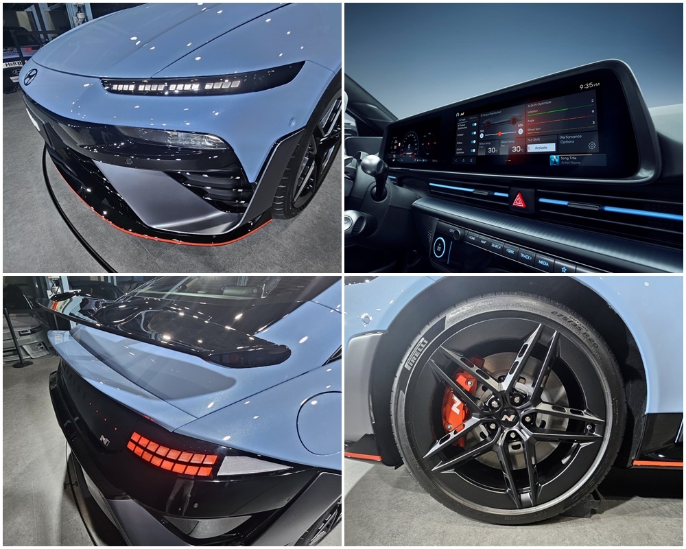 | 아이오닉 6 N 헤드라이트(왼쪽 위부터 시계방향), 계기판과 인포테인먼트 시스템이 연결된 통합형 디스플레이, 대구경 20인치 단조 휠과 피렐리사와 함께 개발한 275/35R20 사이즈의 전용 광폭 타이어, 대형 리어 윙 스포일러. 서재근 기자 |
