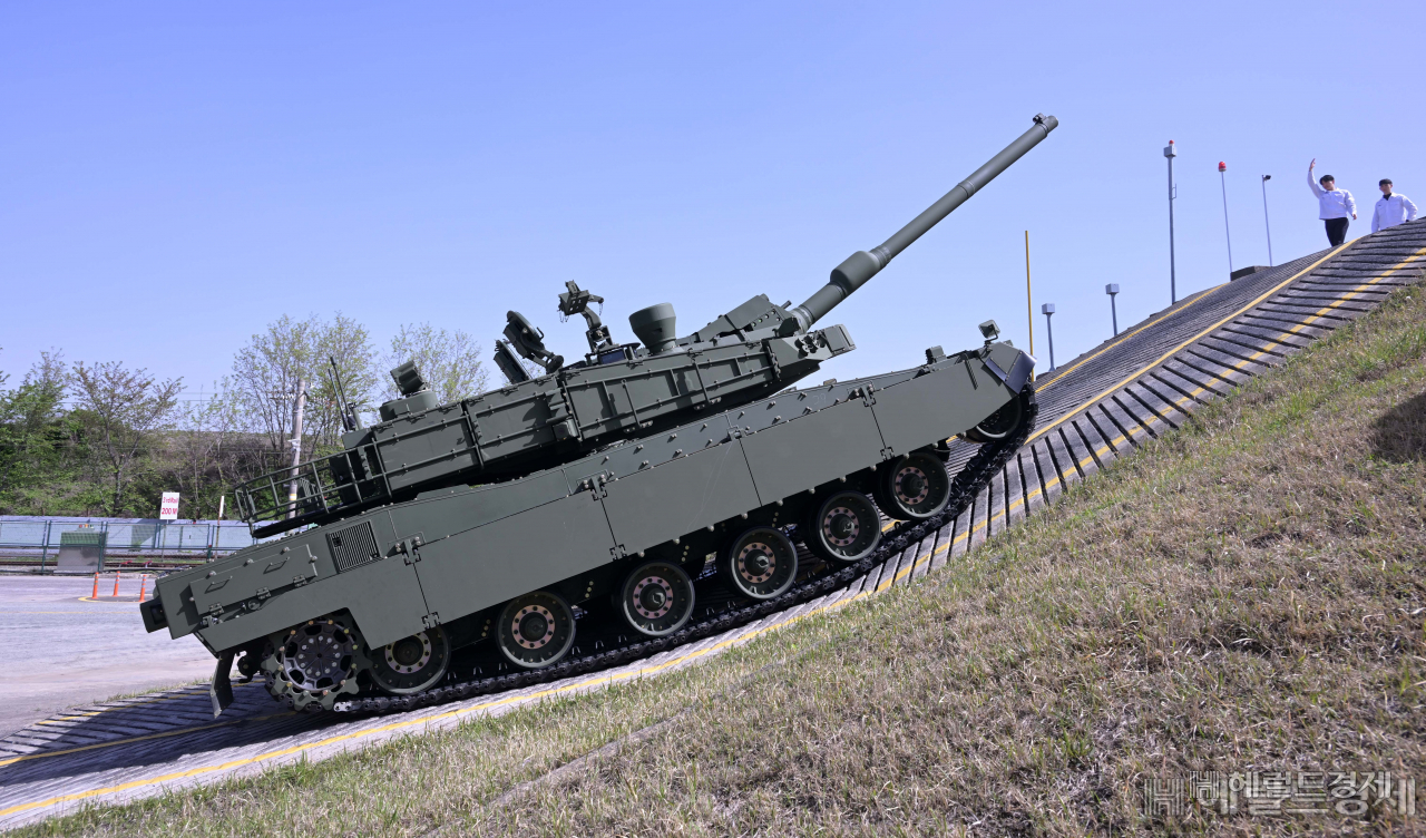 | 현대로템의 K2 전차가 언덕으로 오르고 있다. [이상섭 기자] |