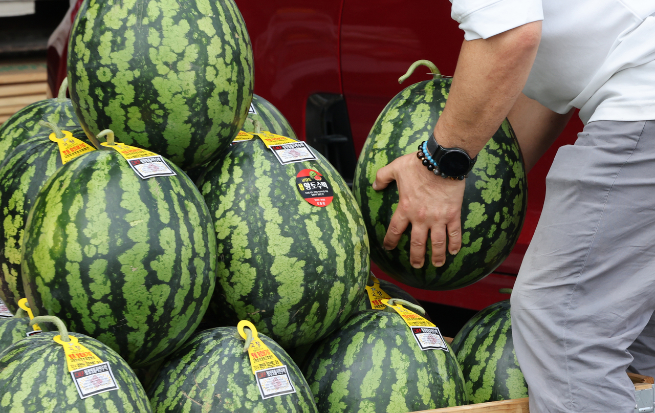 | 13일 서울 송파구 가락동농수산물도매시장에서 시민들이 수박을 구입하는 모습 [연합] |