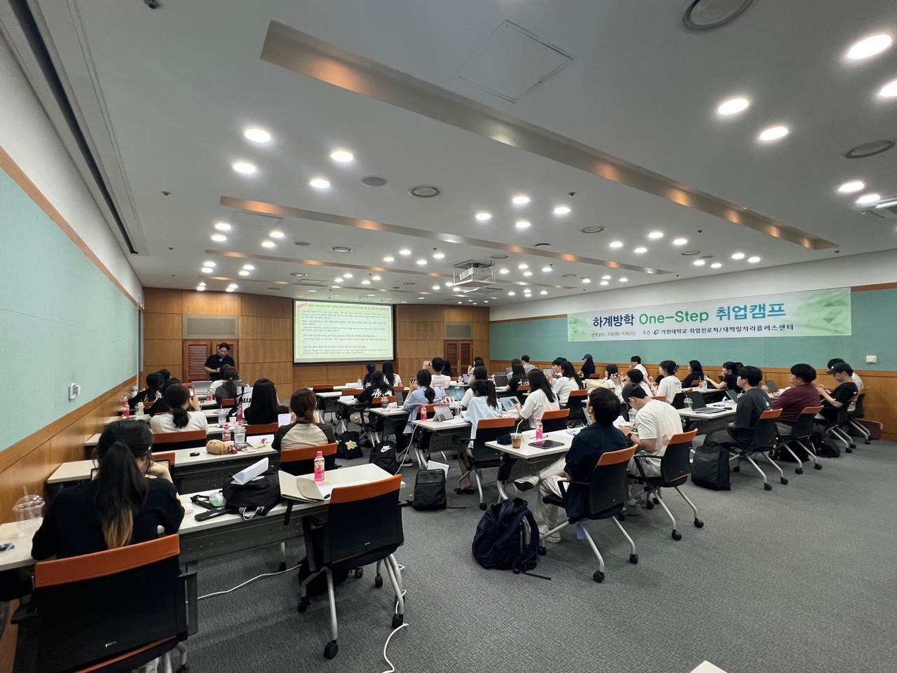 | 가천대학교 졸업예정자와 졸업생들이 대학일자리플러스센터 하반기 채용대비 ‘One-Stop 취업캠프’에 참여해 강의를 듣고 있다.[가천대 제공] |