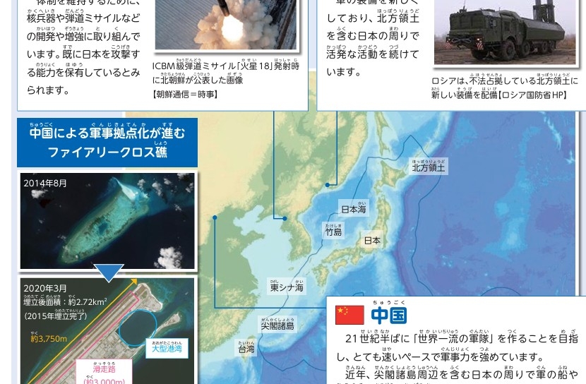 | 일본 정부가 독도에 대해 자국의 고유의 영토라고 주장하는 방위백서의 어린이판을 초등학교에 배포한 것으로 확인됐다. 어린이용 방위백서에 삽입된 지도. [연합] |