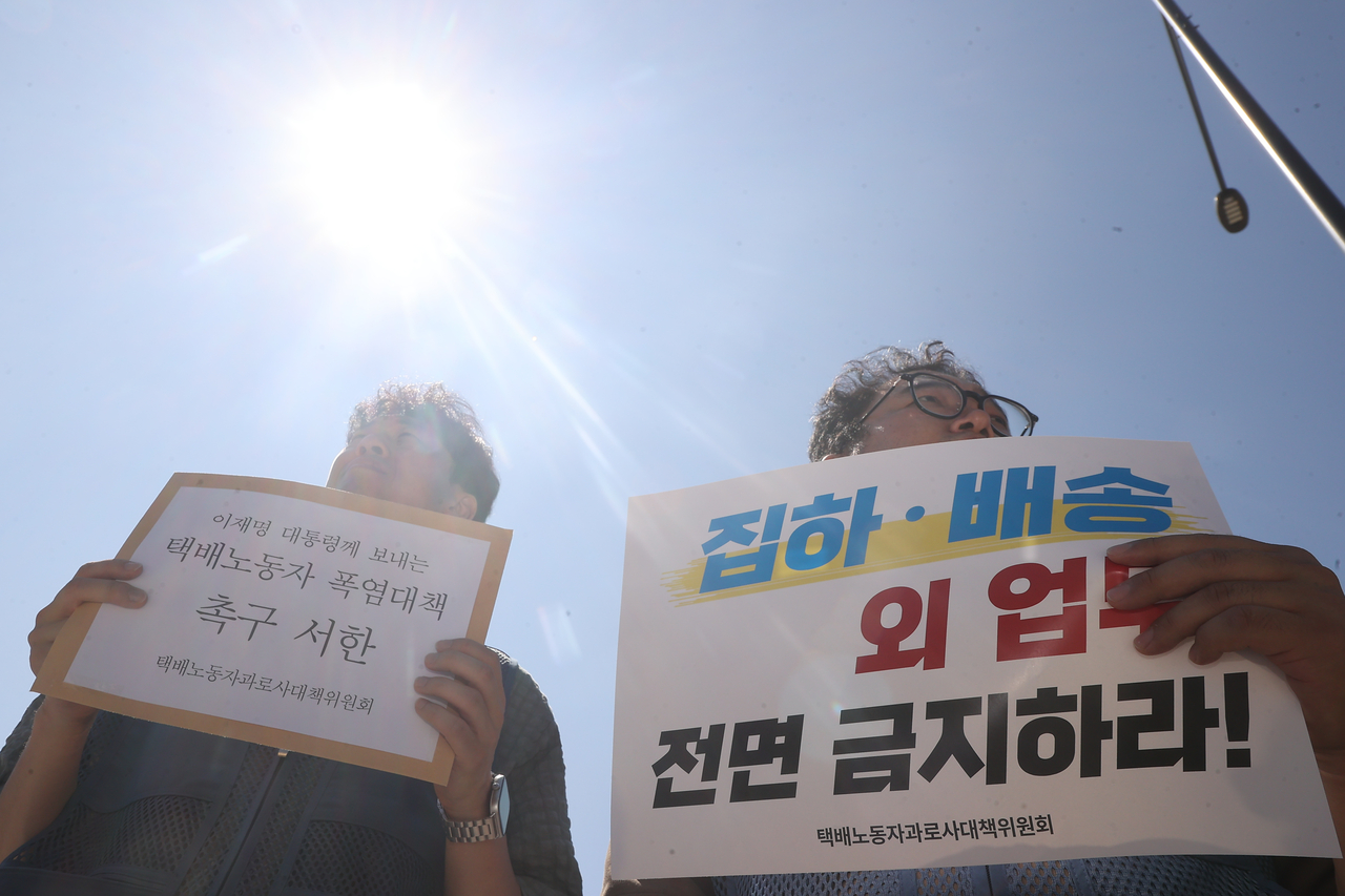 | 11일 서울 용산구 대통령실 인근에서 열린 택배노동자 긴급 폭염대책 및 택배없는 날 시행 촉구 기자회견에서 참석자들이 폭염기간의 택배노동자 근무 대책 마련을 촉구하고 있다. [연합] |