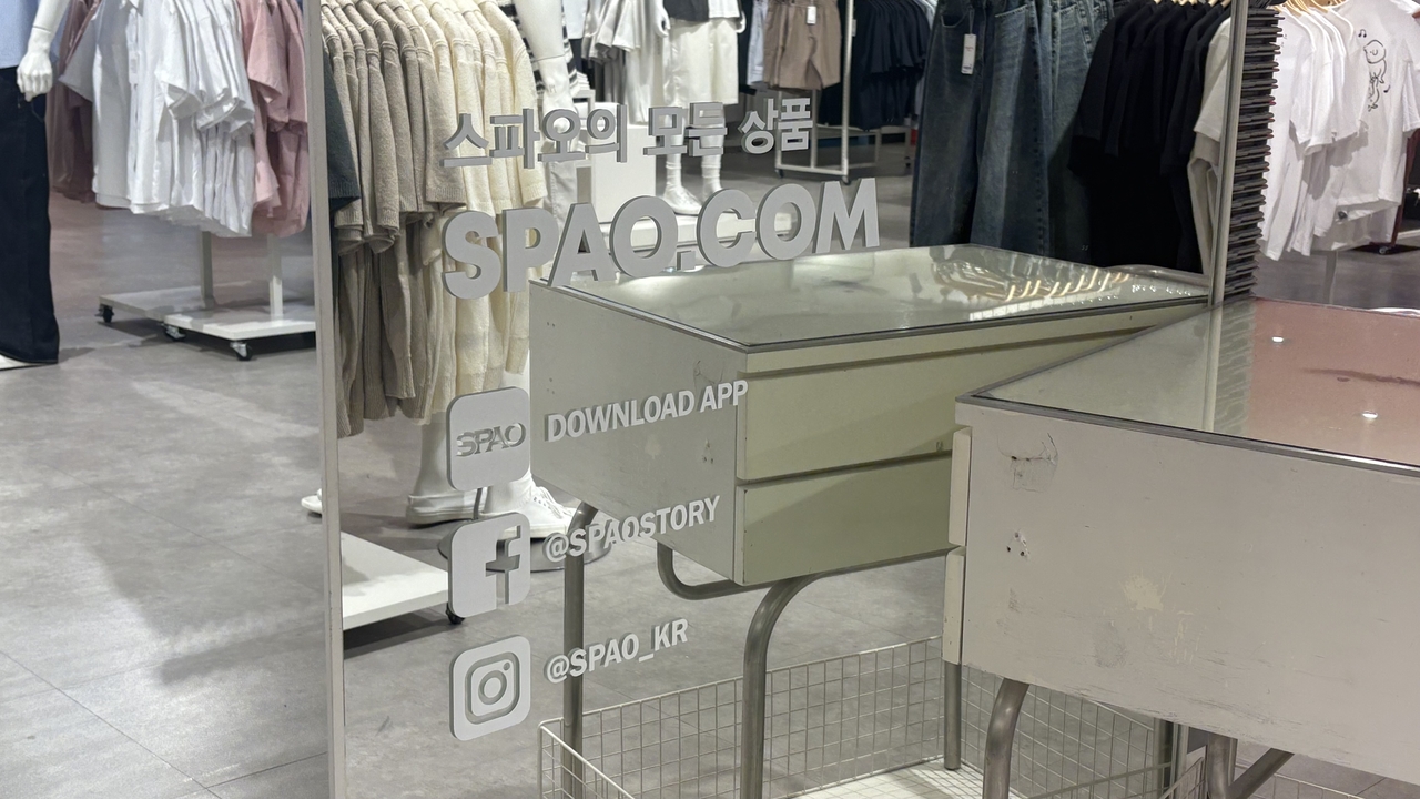 | 스파오 용산 아이파크몰점 매장 내 거울에 붙어있는 자사몰 홍보 박연수 기자 |