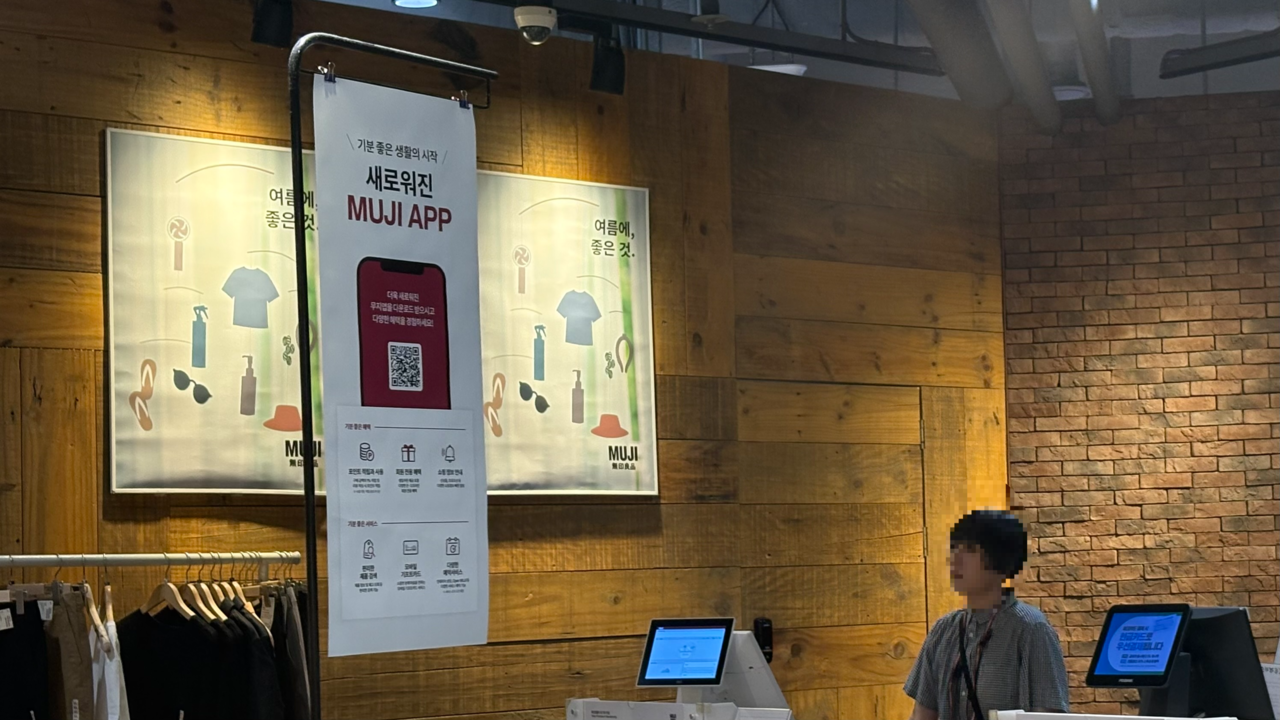 | 지난 15일 서울 용산아이파크몰 일본 라이프스타일 브랜드 무인양품(MUJI) 매장에 앱 홍보 팻말이 설치됐다. 박연수 기자 |