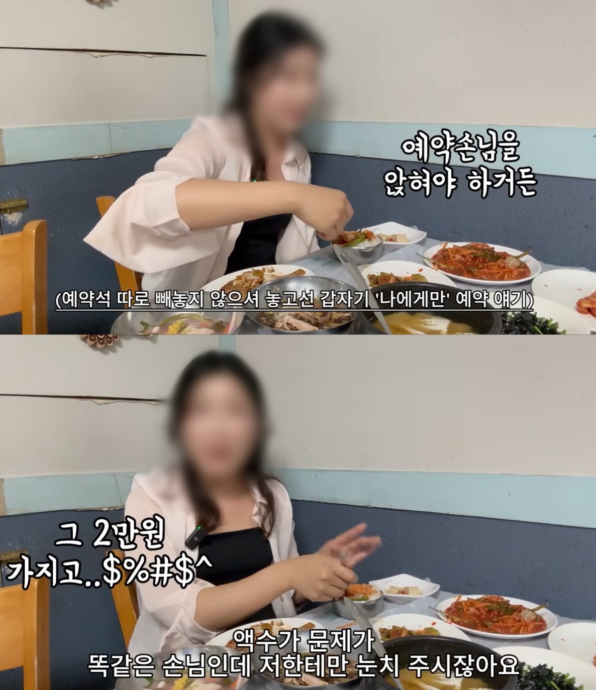 유튜버는 “예약석 따로 빼놓지도 않고 갑자기 내게만 예약 얘기를 했다”며 “주인은 전혀 미안한 태도가 아니었고, 밥 먹는 내가 뭐라도 잘못한 것처럼 혼내는 말투에 가까웠다”고 토로했다.