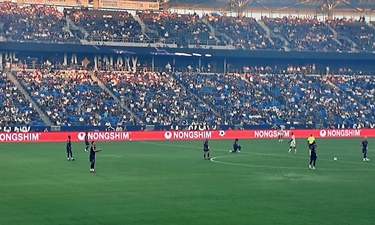 | 미국 축구 구단 LA 갤럭시 홈구장 전광판에 농심 광고가 띄워져 있다. [농심 제공] |