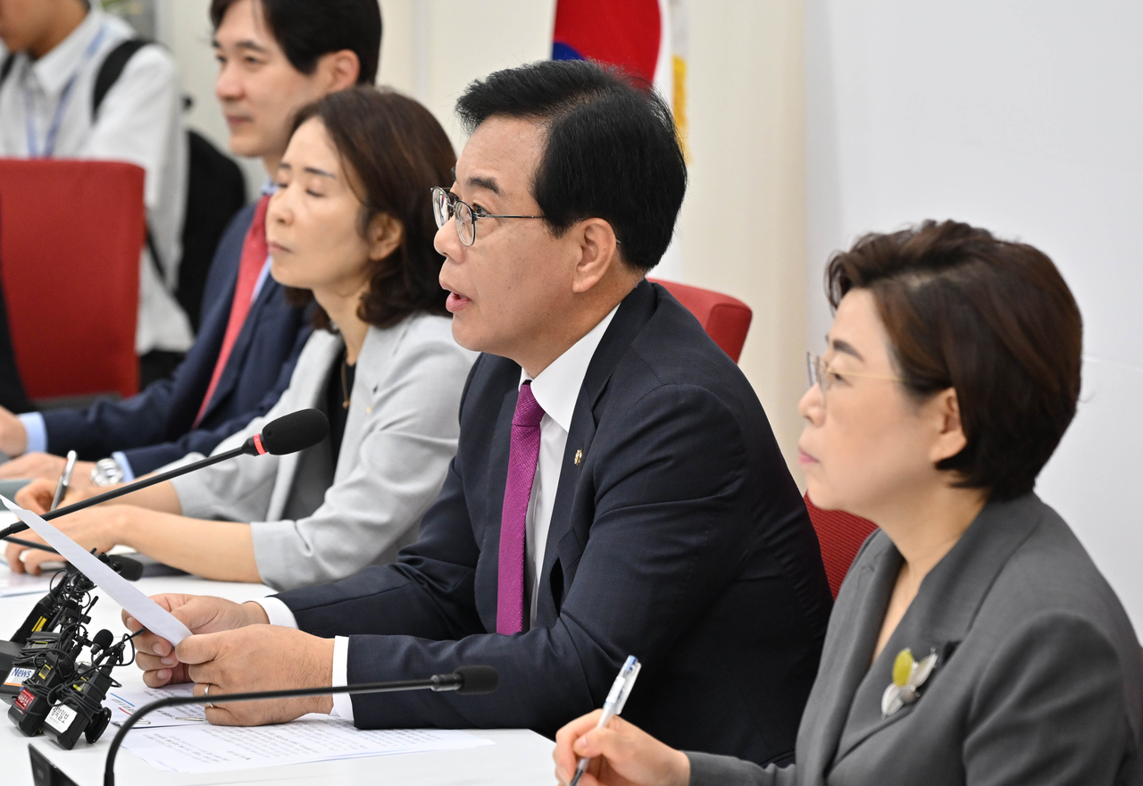 [헤럴드pic] 민주당 최고위·국민의힘 간담회 글꼴 선택 본문 텍스트 크게본문 텍스트 작게 인쇄 김병기 더불어민주당 대표 권한대행 겸 원내대표(위쪽 사진)와 송언석 국민의힘 비상대책위원장 겸 원내대표가 16일 오전 서울 여의도 국회에서 열린 최고위원회의와 현안관련 기자간담회에서 발언하고 있다. 임세준 기자