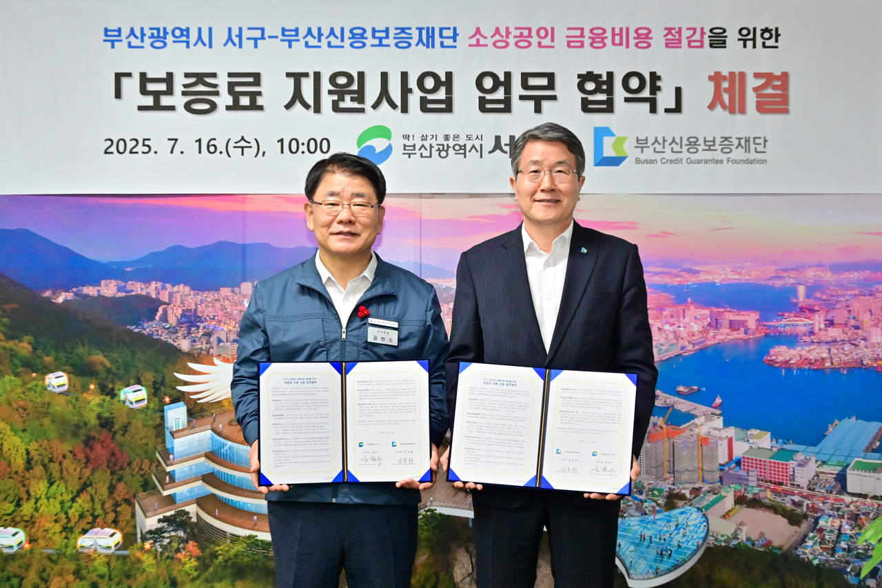 | 공한수 부산 서구청장과 성동화 부산신용보증재단 이사장이 16일 보증료 지원사업 업무협약 체결 이후 기념 촬영을 하고 있다. [부산 서구 제공] |