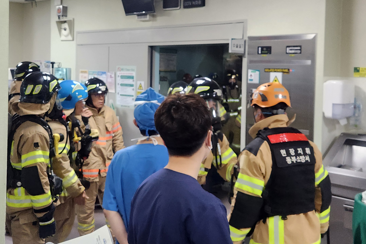 | 14일 오전 광주 동구 조선대병원에서 불이 나 10여분 만에 자체 진화됐다. 사진은 소방대원들이 화재 수습을 위해 수술실로 이동하는 모습. 2025.7.14 [광주 동구 제공. 재판매 및 DB 금지] <연합뉴스> |