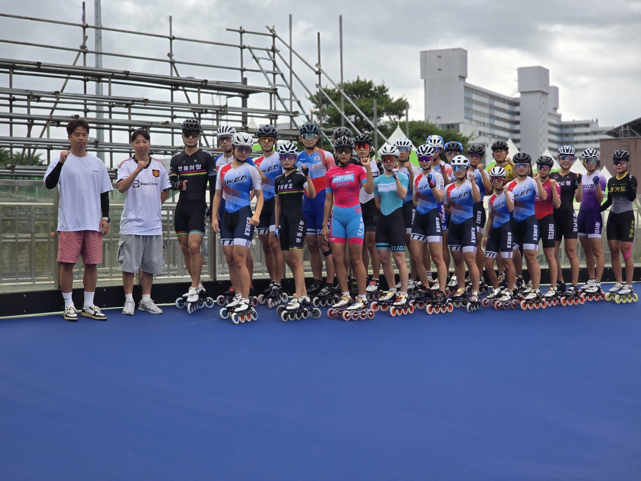 | 아시아 최대 규모의 롤러스포츠 대회인 ‘2025 아시아 롤러스케이팅 선수권대회’가 7월 19~30일 제천에서 열리는 가운데, 참가 선수 및 연맹 임원들이 파이팅 하고 있다. 사진=대한롤러스포츠연맹 |